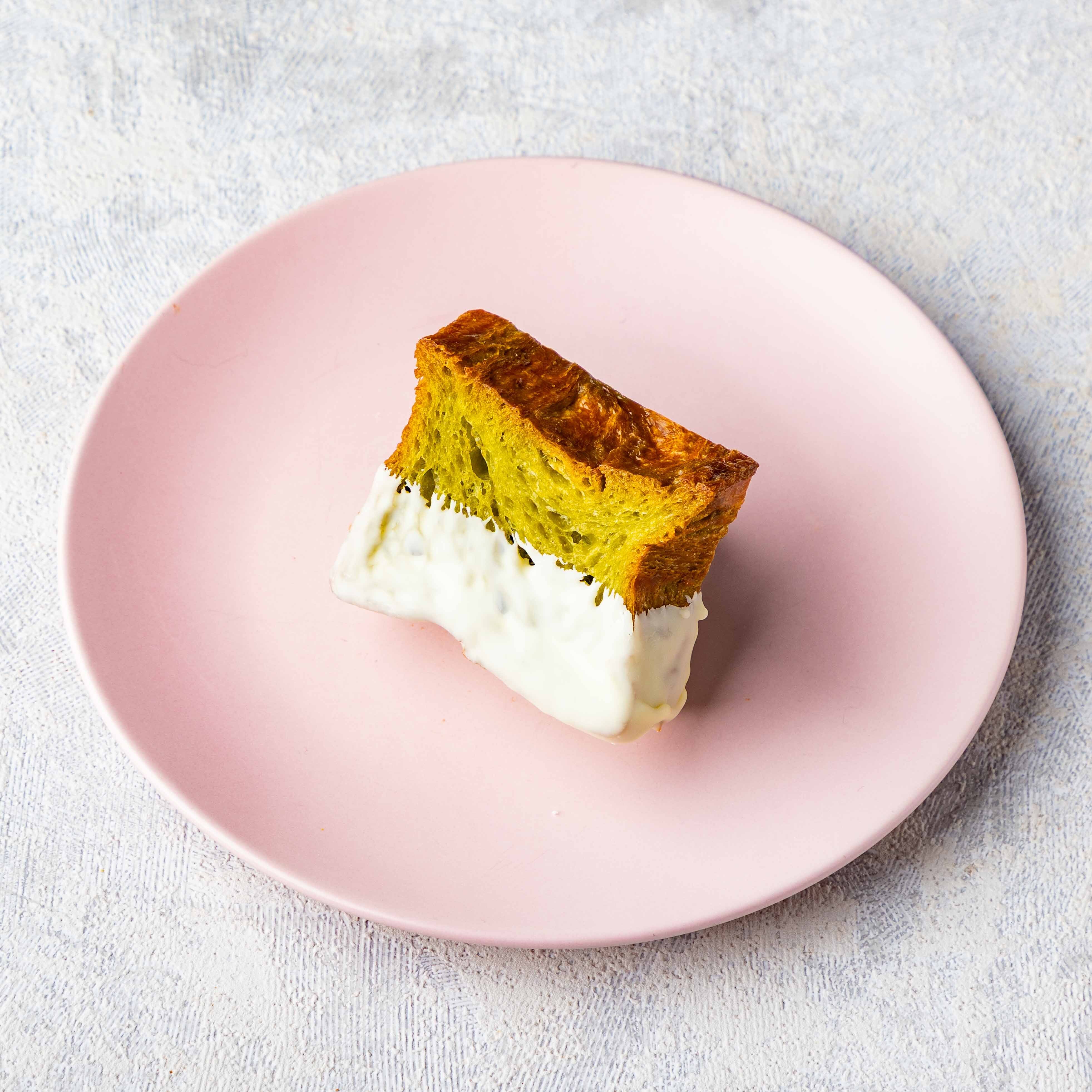 しっとり生地のパンに、卵・牛乳・生クリームをじっくり浸し、抹茶で味を調えました。仕上げにホワイトチョコレートでコーティングしています!